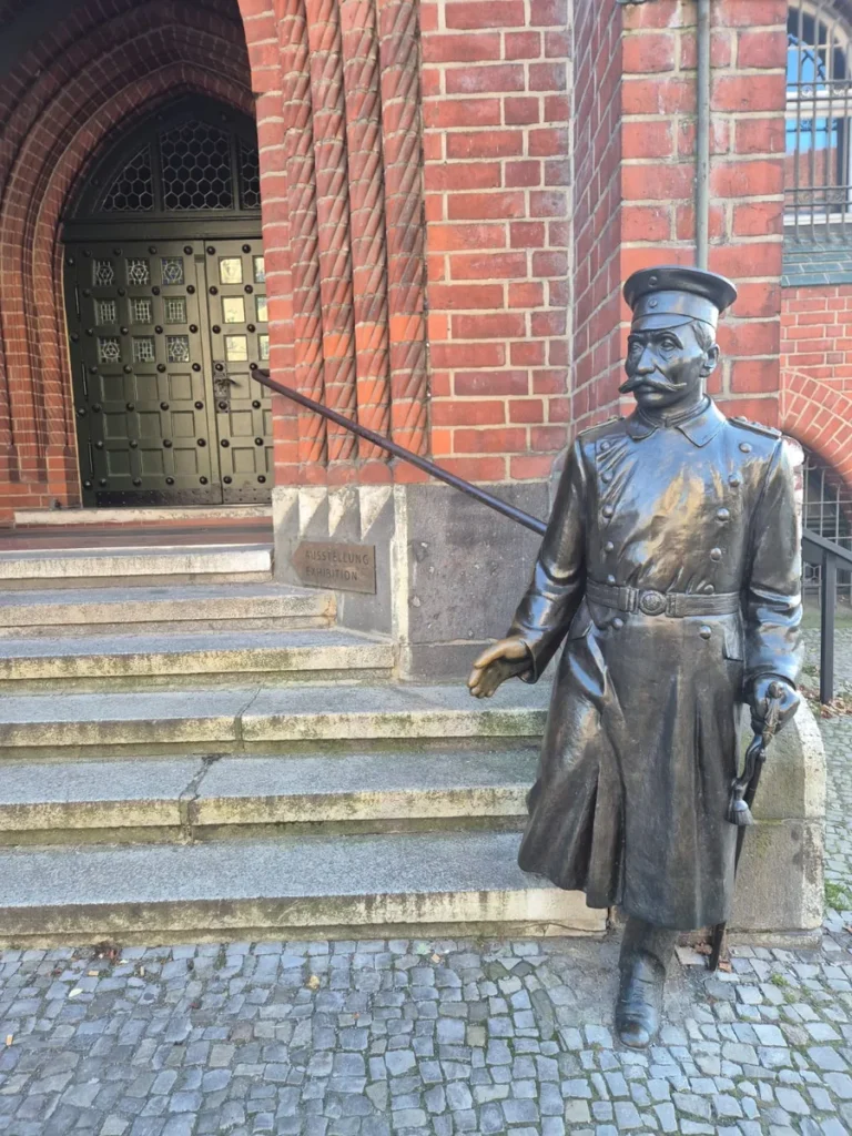 Direkt vor dem Eingang begrüßt die Bronzestatue des „Hauptmanns“ die Besucher. Die Geschichte des Schuhmachers Wilhelm Voigt, der 1906 als falscher Hauptmann das Rathaus besetzte, machte Köpenick weltweit bekannt.